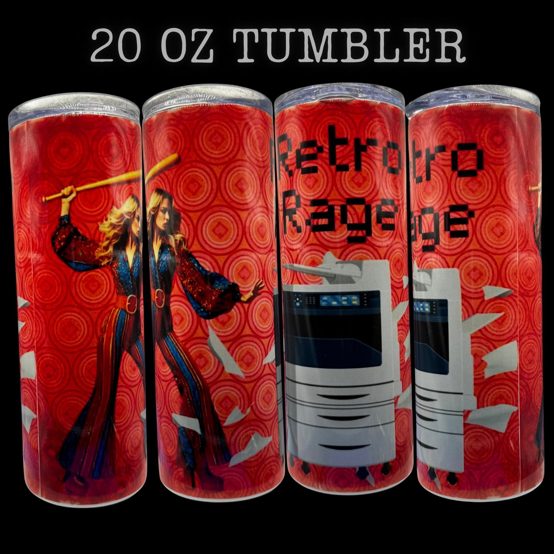 This 20 oz tumbler features dynamic retro imagery layered over a vivid backdrop, perfect for adding a splash of nostalgia to your modern workspace.